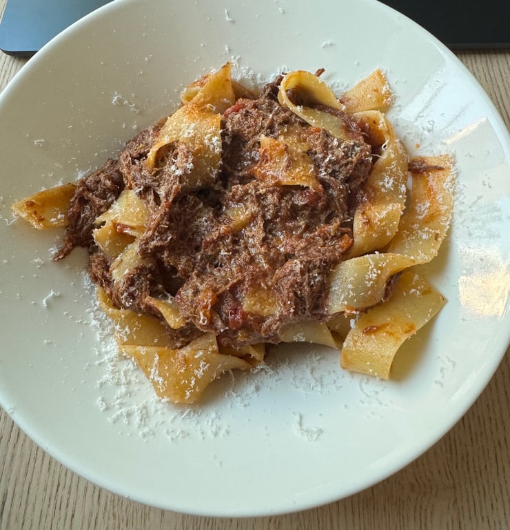 Proper Bolognese ragù requires cooking for 3-4 hours. This has one very interesting implication – it's perfectly suited for swapping simple ground beef with chunks of beef that slowly transform into tender, rich and flavorful pulled beef.