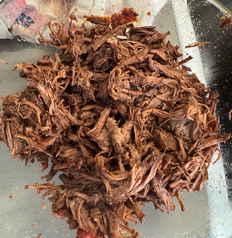 Pull the meat out for the final time. It should fall apart when pressed with a spoon. Shred it and return to the pot.