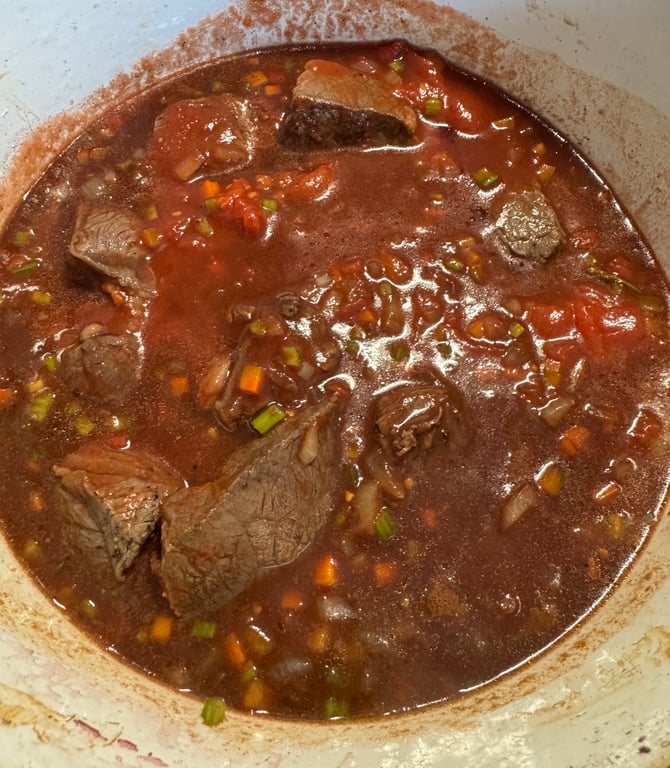 Set heat to high. Fry meat in large chunks to achieve browning on all sides. Remove it from the pot, add olive oil and veggies. Fry until they soften. Add meat back and put all other ingredients in. Put to oven at 175°C for 4 hours. This is how it looks before:
